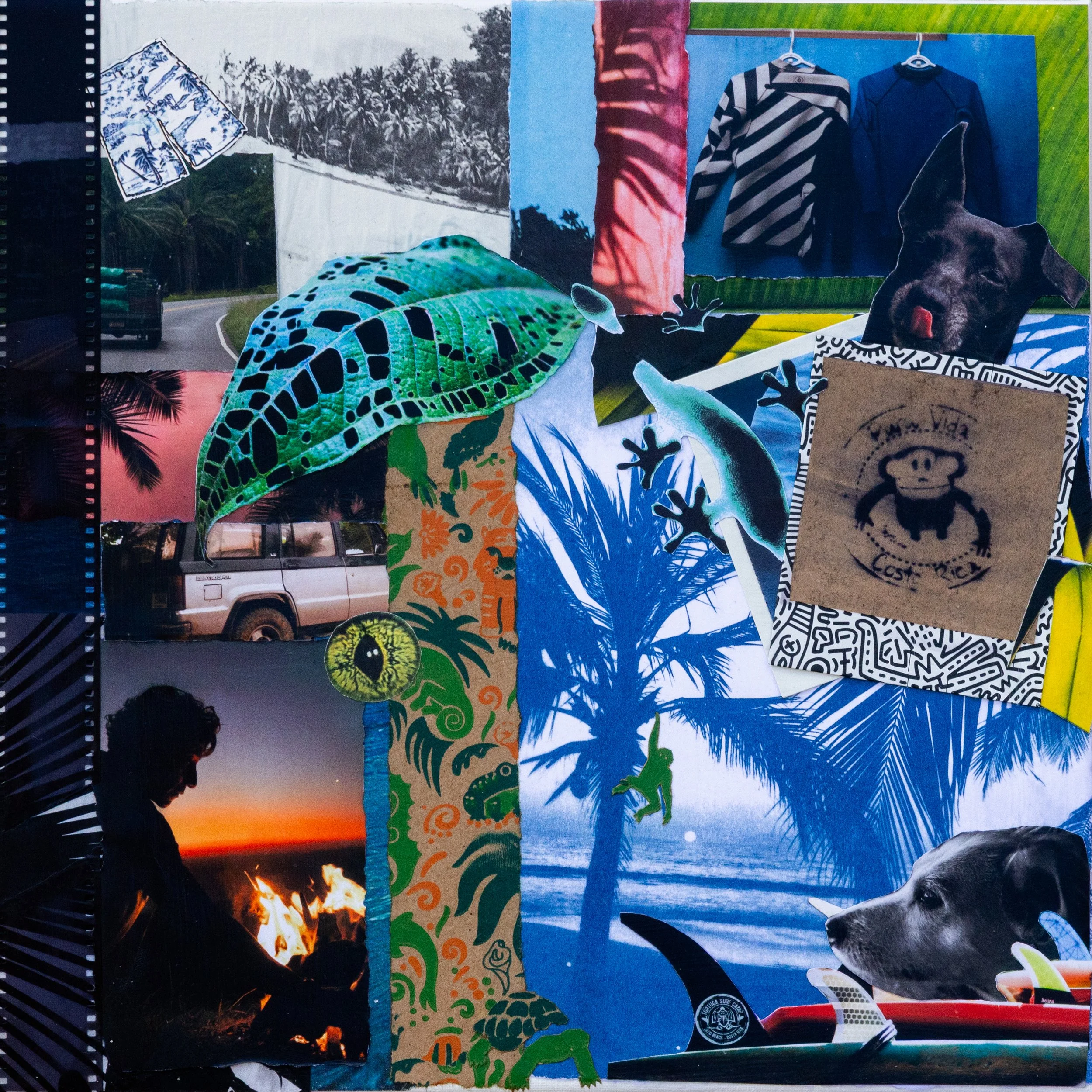 A growing collection of surf-inspired crafts collaged with a variety of old surf magazines, polaroids, pressed flowers, and more.